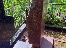 Вертикальный памятник из красного гранита было решено не трогать, и работы по его восстановлению проводились на установленном надгробье: мы восстановили надпись на памятнике и удалили образовавшийся на камне налёт.