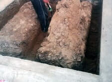 Результат нашей работы| Исходное состояние: | Стандартный ленточный фундамент по периметру участка, металлический крест и мраморная плита с надписью |